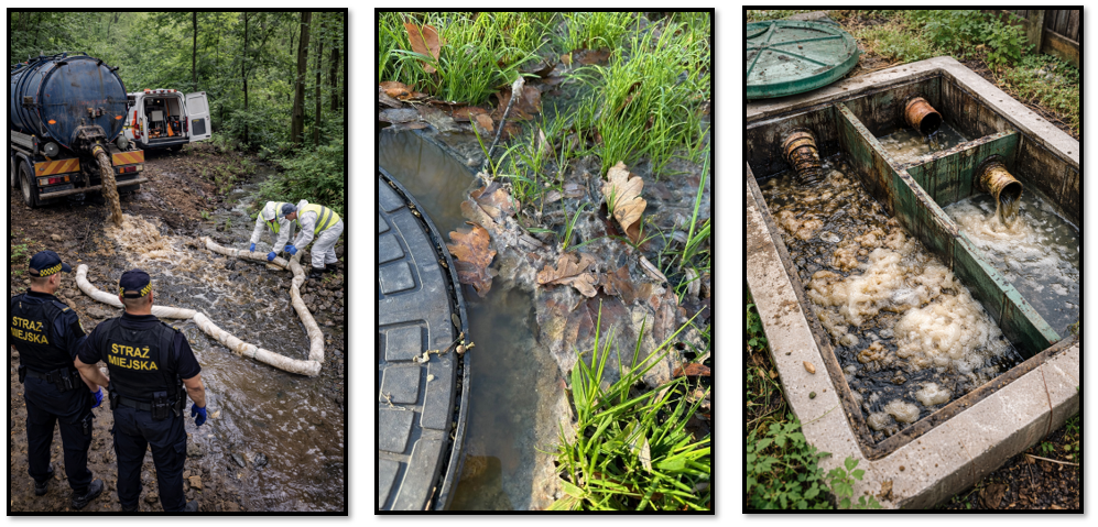 Fot. 1. Nieprawidłowości w gospodarowaniu ściekami bytowymi - nielegalny zrzut do koryta cieku wodnego, przepełnienie zbiornika i wypływ ścieków poprzez wieko studzienki oraz nieodpowiednia eksploatacja przydomowej oczyszczalni ścieków.